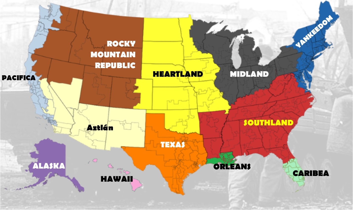 Such was the case with the ancient Roman Empire. It was built on the untruth of Paganism, so it was destined to collapse. When it did, it was eventually replaced by Christendom, which lasted more than a thousand years, until various countries abandoned the Catholic Church and eventually started tinkering with other systems of government that no longer acknowledged Christ or his Catholic Church. Those governments lasted (or will last) only insofar as they embrace some objective truth. The less objective truth they embrace, the quicker they will fall. The Soviet Union, for example, lasted only 75 years, having embraced the untruth of godless atheism, legalized theft, institutionalized covetousness, and for a time, mandated adultery and fornication (but that’s another story). It collapsed under its own weight and moral bankruptcy. Today, President Vladimir Putin is encouraging a return to Russian Orthodoxy, because he knows that without Christianity, the new Russian Federation will suffer the same fate as the Soviet Union. He’s even toying with the idea of bringing back the czars! Nazi Germany lasted only 12 years, having prematurely fallen by its own bad strategic decisions, which again were made by failure to embrace objective truth. It is doubtful the Third Reich would have lasted more than a couple generations, even if it had behaved well by not attacking its neighbors. This is because Nazism embraced the untruth of Heathen Paganism, combined with obsolete race theory, along with a cruel interpretation of natural selection. Even if it survived World War II, it’s collapse was inevitable. Communist China should have collapsed years ago. It remains only because of economic mollycoddling by Western powers through sweetheart trade deals. France has gone through no less than five separate republics since throwing off their monarchy in the French Revolution, mainly because of its governmental rejection of objective Catholic truth, embracing the ideologies of the Enlightenment and Freemasonry. The United States is currently in decline, and will likely collapse at some future date, partly because America’s founders rejected some objective truths at its founding, but mostly because the US Federal Government rejected all objective truth in the 1960s, starting with John F. Kennedy’s 1960 speech to the Houston Ministerial Association, where he distanced his political beliefs from his Catholic Faith. That set a dangerous precedence. It was followed by Supreme Court decisions that ended prayer in public school. The United States government took an extreme anti-religion position in the years that followed, effectively sending the message that objective truth is unknowable. It’s no coincidence that America’s downward spiral began in the 1960s and has not stopped since. America’s decline will continue until the American people demand a government that returns to the objective truth of the Christian Faith. If we don’t, then our federal government will inevitably collapse. After that, who knows what happens!? Do we start over with another one? — like France? Or do we break up into different countries — each trying something different — like the Soviet Union? I think it will most likely be the latter. The following maps are concepts that shouldn’t be taken too seriously, but nevertheless capture the idea of what may soon await the late, great United States if the people fail to demand a return to Christian governance…
